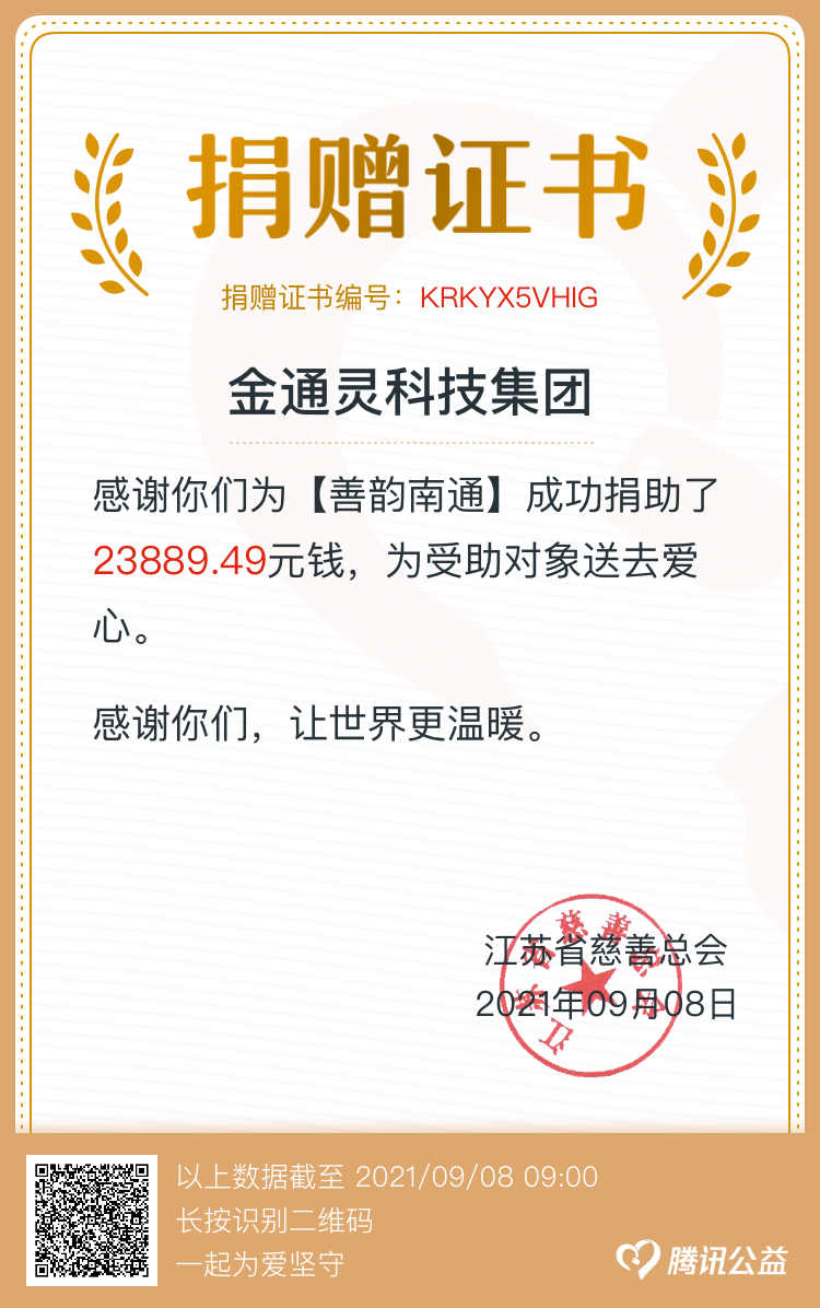 近日,我市組織開展“博愛在南通 慈善暖江海”慈善一日捐活動,金通靈積極響應產控集團的號召,第一時間組織開展一日捐活動。截止到9月8日,金通靈共籌得善款23889.49元,募集資金將統一交至南通市慈善總會,繼續用于扶貧、慈善救助項目。